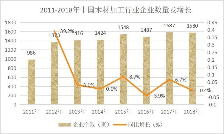 改革開(kāi)放以來(lái),經(jīng)過(guò)40年的發(fā)展,我國木材加工行業(yè)已經(jīng)取得長(cháng)足發(fā)展,2018年銷(xiāo)售規模已達1999.35億元,規模以上企業(yè)數量達1580家。在此背景下,鋸材、木片、人造板、木制品等細分市場(chǎng)也有顯著(zhù)發(fā)展。